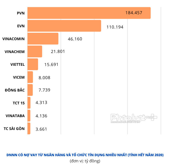 Một số Tập đoàn, Tổng công ty nhà nước có số nợ vay từ các NHTM và TCTD lớn như EVN (110.194 tỷ đồng); PVN (184.457 tỷ đồng); Vinachem (21.801 tỷ đồng); Viettel (15.691 tỷ đồng)...