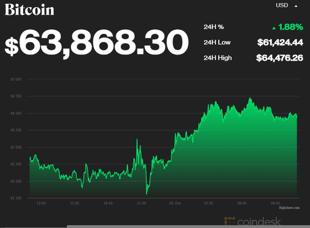 Bitcoin tăng lên ngưỡng 64.000 USD
