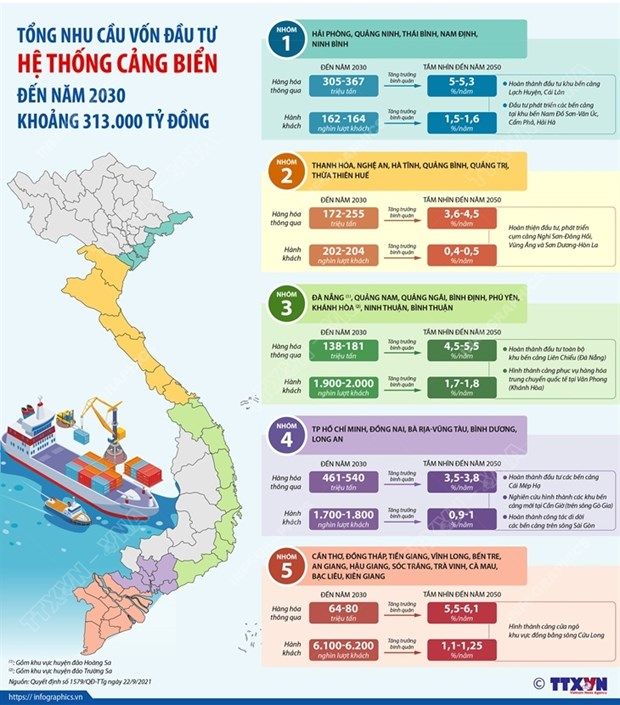 Theo Quy hoạch tổng thể phát triển hệ thống cảng biển Việt Nam thời kỳ 2021-2030, tổng nhu cầu vốn đầu tư hệ thống cảng biển đến năm 2030 khoảng 313.000 tỷ đồng