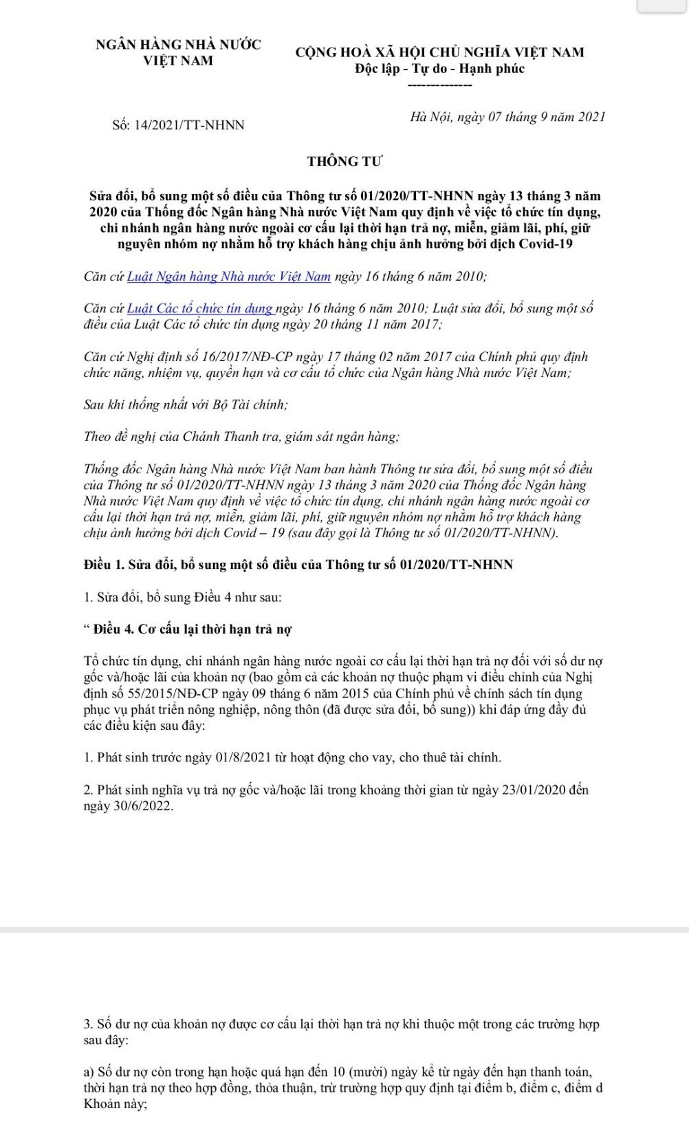 Ngân Hàng NNVN vừa có Thông tư số 14/2021/TT-NHNN ngày 07 tháng 9 năm 2021 sửa đổi, bổ sung một số điều của Thông tư số 01/2020/TT-NHNN ngày 13 tháng 3 năm 2020 của Thống đốc Ngân hàng Nhà nước Việt Nam quy định về việc tổ chức tín dụng, chi nhánh ngân hàng nước ngoài cơ cấu lại thời hạn trả nợ, miễn, giảm lãi, phí, giữ nguyên nhóm nợ nhằm hỗ trợ khách hàng chịu ảnh h