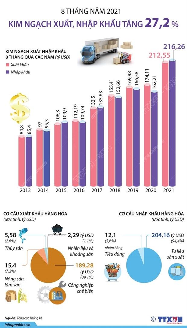 [Infographics] 8 tháng năm 2021, kim ngạch xuất, nhập khẩu tăng 27,2%