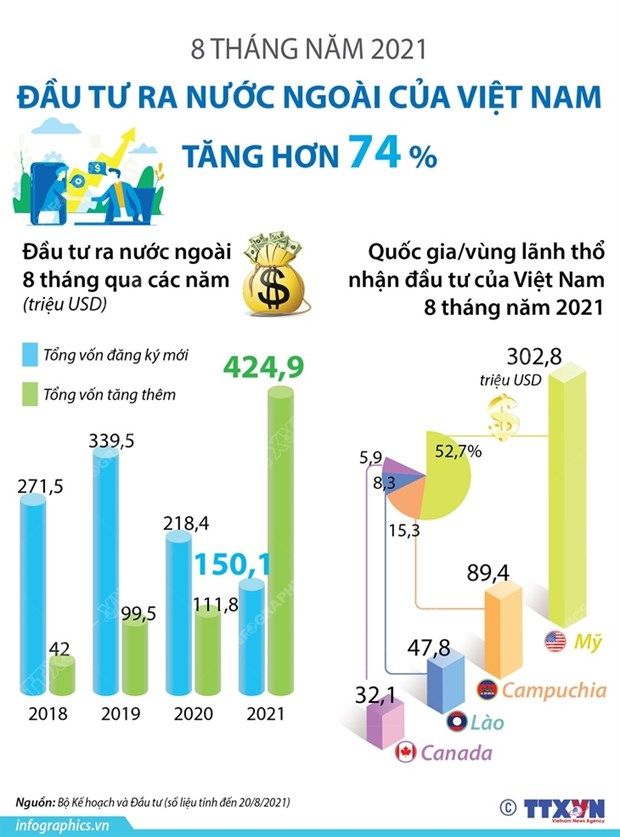 Trong 8 tháng năm 2021, tổng vốn đầu tư của Việt Nam ra nước ngoài cấp mới và tăng thêm đạt 575 triệu USD, tăng 74,2% so với cùng kỳ năm 2020.