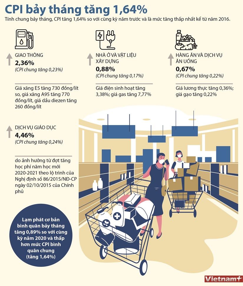 Tính chung bảy tháng, CPI tăng 1,64% so với cùng kỳ năm trước và là mức tăng thấp nhất kể từ năm 2016. Bên cạnh đó, lạm phát cơ bản bảy tháng tăng 0,89% là mức thấp nhất kể từ năm 2011.