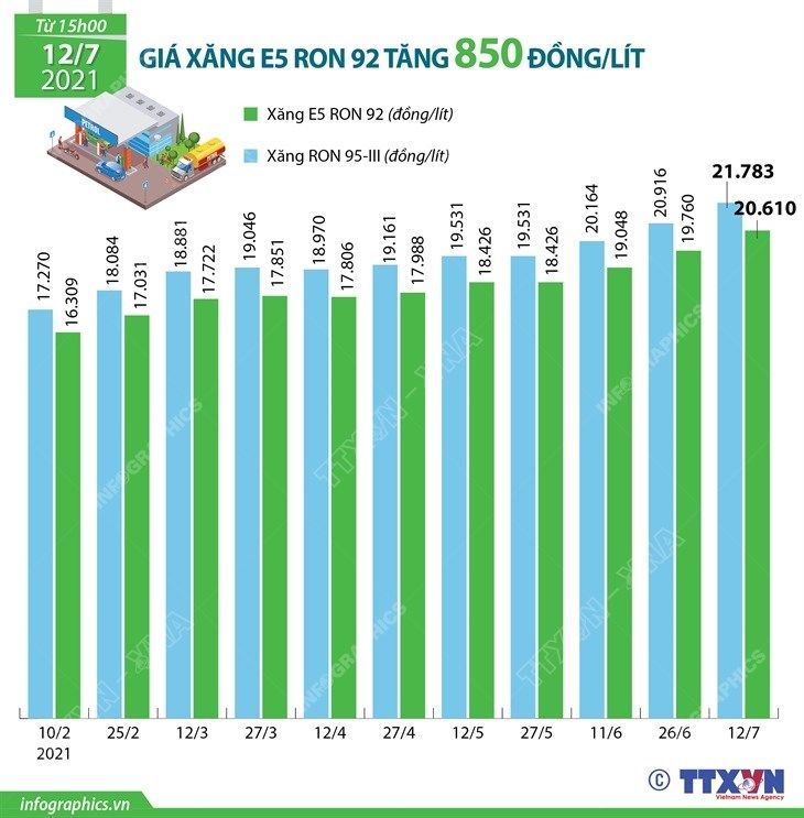 [Infographics] Giá xăng E5 RON 92 tăng 850 đồng mỗi lít
