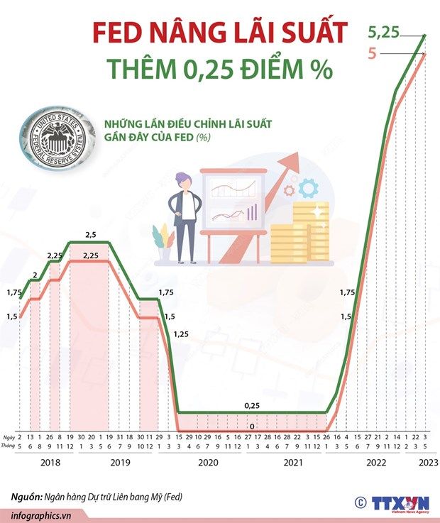 Ngày 3/5 (giờ địa phương), Ngân hàng Dự trữ Liên bang Mỹ (Fed) đã tăng lãi suất cho vay qua đêm thêm 0,25 điểm phần trăm, lên khoảng 5,00-5,25%.