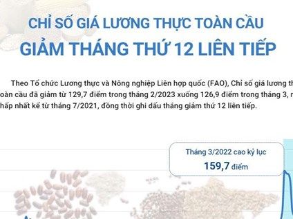 Chỉ số giá lương thực toàn cầu của FAO đã giảm từ 129,7 điểm trong tháng 2/2023 xuống 126,9 điểm trong tháng 3, mức thấp nhất kể từ tháng 7/2021, ghi dấu tháng giảm thứ 12 liên tiếp.