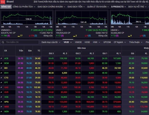 Kết phiên giao dịch chứng khoán ngày 30/3, VN-Index tăng 3,11 điểm lên 1.059,44 điểm, giá trị khối lượng giao dịch toàn thị trường hơn 12.500 tỷ đồng