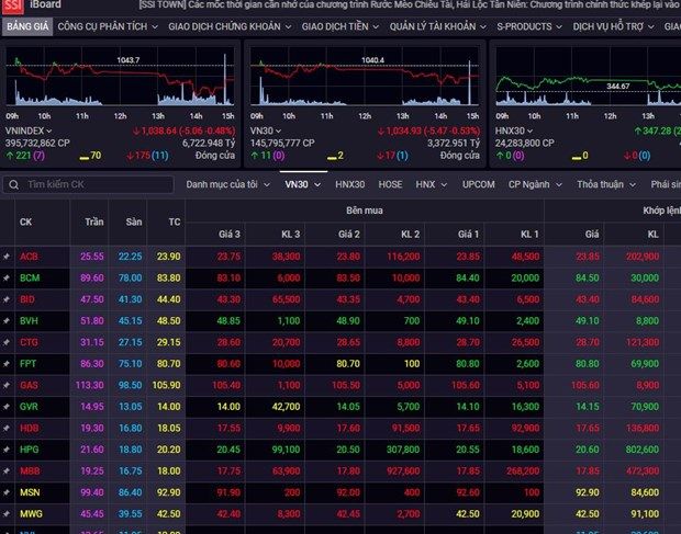 Kết phiên giao dịch chứng khoán ngày 14/2, VN-Index giảm 5,06 điểm xuống 1.038,64 điểm, giá trị khối lượng giao dịch toàn thị trường đạt hơn 6.722 tỷ đồng.