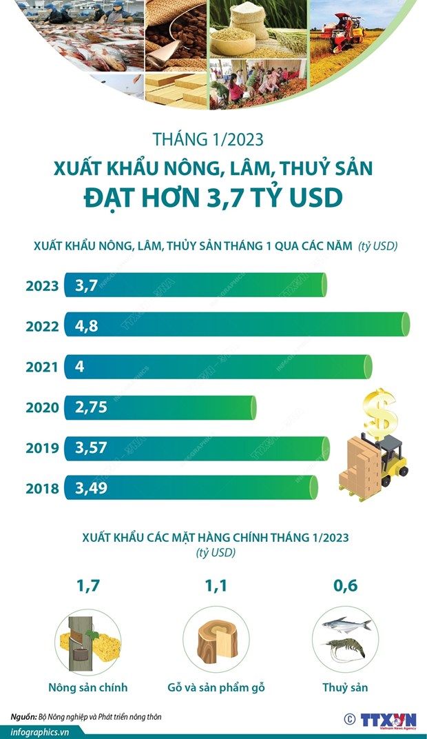 Do thời gian nghỉ Tết Nguyên đán và tác động khó khăn về đơn hàng khiến giá trị xuất khẩu nông, lâm, thủy sản trong tháng 1/2023 chỉ đạt hơn 3,7 tỷ USD, giảm hơn 23% so với cùng kỳ năm ngoái.