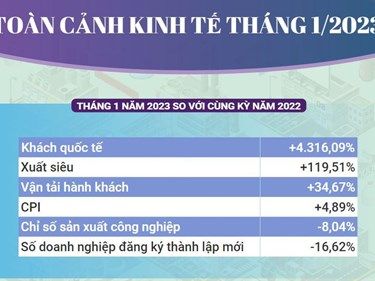 Trong tháng 1 năm 2023, khách quốc tế đến Việt Nam cao gấp 44 lần cùng kỳ năm 2022, xuất siêu tăng hơn 2 lần, chỉ số sản xuất công nghiệp giảm 8%, CPI tăng 4,89%.