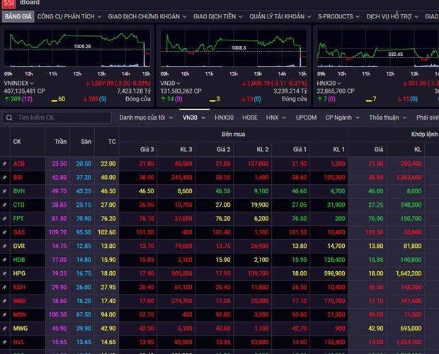 Kết phiên giao dịch ngày 30/12, VN-Index giảm 2,20 điểm xuống 1.007,09 điểm; thanh khoản thị trường cũng tiếp tục ở mức thấp khi chỉ đạt hơn 7.000 tỷ đồng trên HOSE.