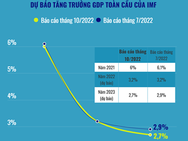 Theo IMF, tăng trưởng GDP toàn cầu năm 2023 sẽ giảm xuống 2,7% do lãi suất tăng làm chậm đà tăng trưởng nền kinh tế Mỹ trong khi châu Âu chật vật với giá khí đốt tăng.