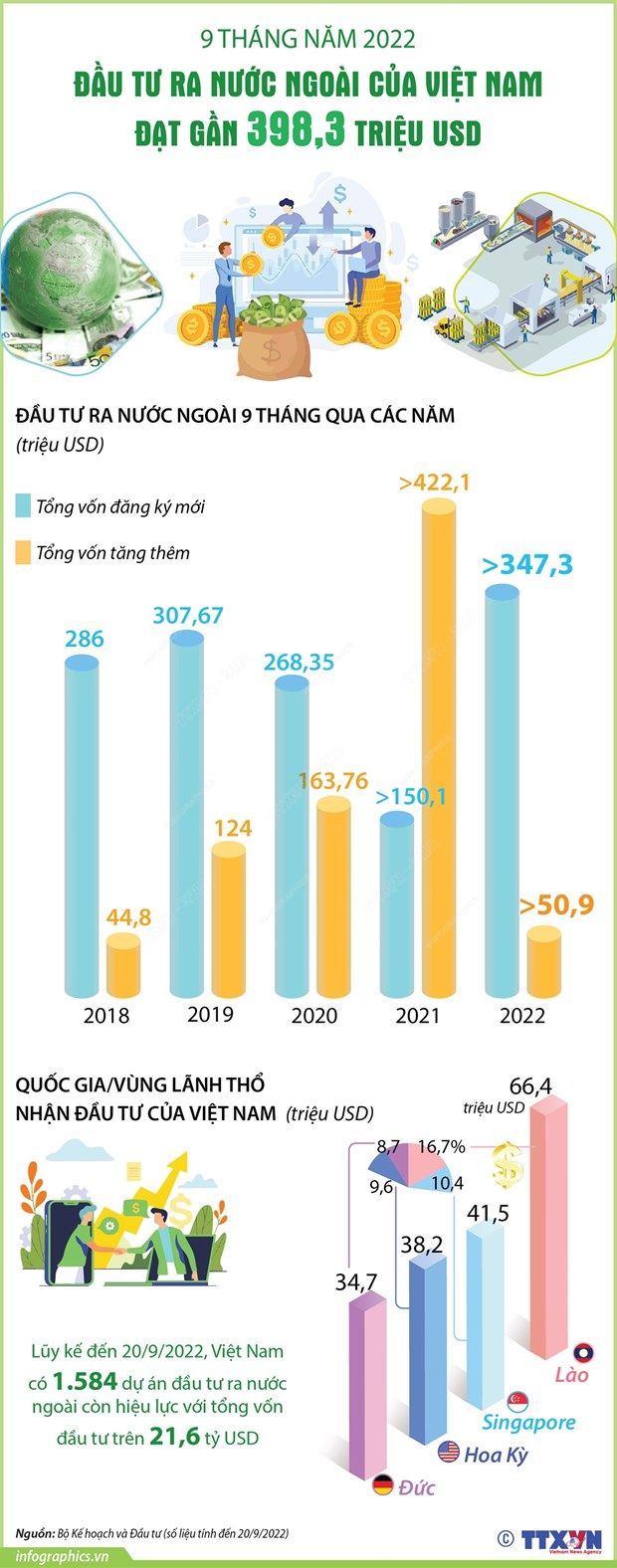 Chín tháng năm 2022, tổng vốn đầu tư của Việt Nam ra nước ngoài cấp mới và điều chỉnh đạt gần 398,3 triệu USD, bằng 69,6% với cùng kỳ năm 2021.