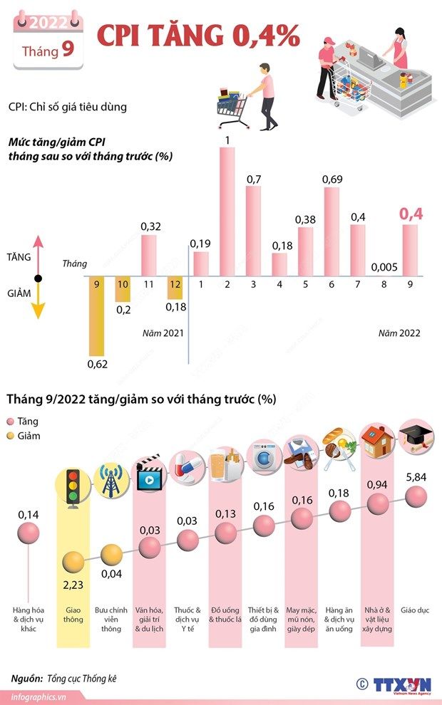 [Infographics] Chỉ số giá tiêu dùng cả nước tháng 9 năm 2022 tăng 0,4%