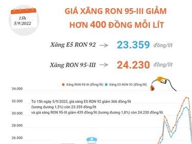 Tại kỳ điều chỉnh ngày 5/9/2022, giá xăng RON 95-III giảm hơn 400 đồng mỗi lít, còn 24.230 đồng/lít; giá xăng E5 RON 92 giảm hơn 300 đồng mỗi lít, còn là 23.359 đồng/lít.