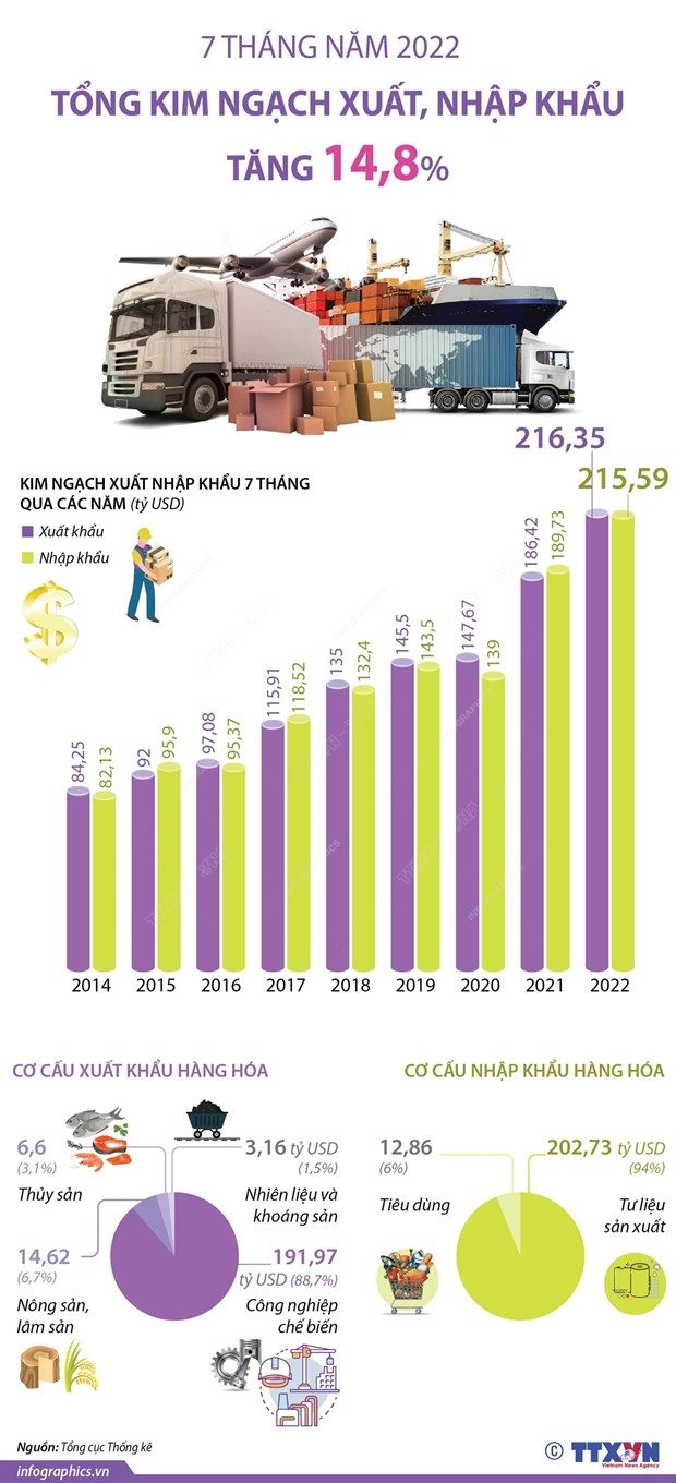 Bảy tháng năm 2022, tổng kim ngạch xuất, nhập khẩu hàng hóa ước đạt 431,94 tỷ USD, tăng 14,8% so với cùng kỳ năm trước trong đó xuất khẩu tăng 16,1% nhập khẩu tăng 13,6%.