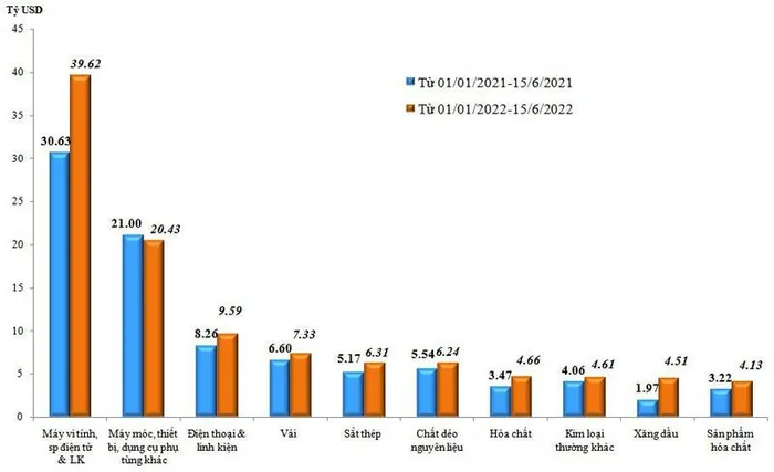 Tính đến hết 15/6/2022, tổng trị giá nhập khẩu của cả nước đạt 169,58 tỷ USD, tăng 16,3% (tương ứng tăng 23,8 tỷ USD) so với cùng kỳ năm 2021.