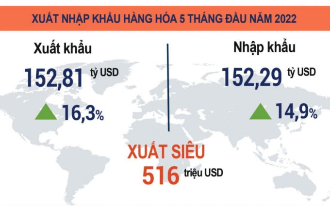 Theo Tổng cục Thống kê, trong tháng 5, Việt Nam ước tính nhập siêu 1,73 tỷ USD. Tuy nhiên, tính chung 5 tháng đầu năm 2022, cán cân thương mại hàng hóa ước tính xuất siêu 516 triệu USD. Con số này vẫn cải thiện hơn so với cùng kỳ năm trước khi nhập siêu 1,24 tỷ USD.