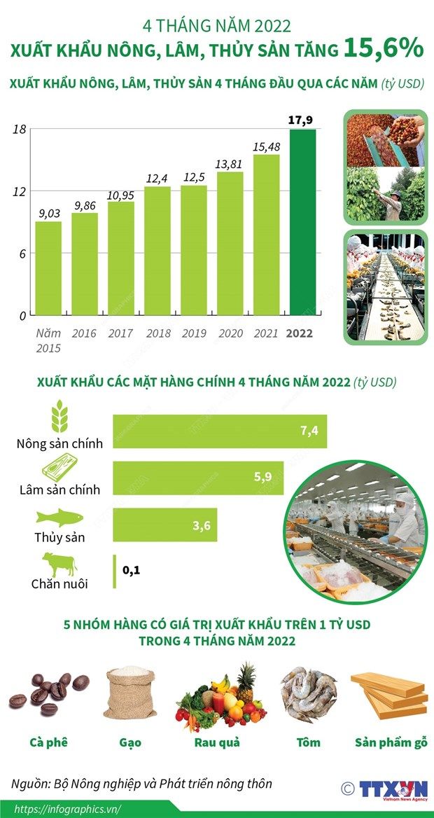 Trong 4 tháng đầu năm nay, giá trị xuất khẩu hàng nông, lâm, thủy sản của cả nước đạt khoảng 17,9 tỷ USD, tăng 15,6% so với cùng kỳ năm 2021.