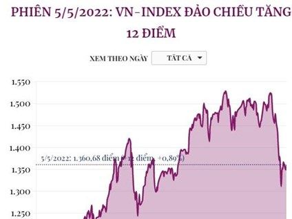 Phiên 5/5/2022, VN-Index có thời điểm mất hơn 17 điểm. Tuy nhiên, nhờ lực kéo của nhiều cổ phiếu lớn, VN-Index đảo chiều tăng 12 điểm, kết phiên ở 1.360,68 điểm.
