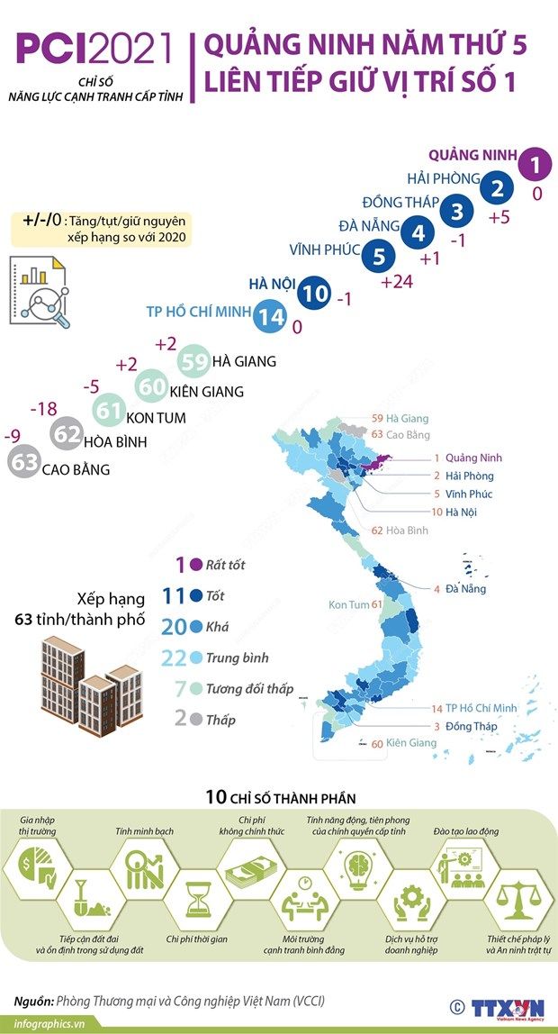 Theo Phòng Thương mại và Công nghiệp Việt Nam, năm 2021, Quảng Ninh tiếp tục dẫn đầu bảng xếp hạng PCI với số điểm đánh giá 73,02, giảm gần 3 điểm so với năm 2020.