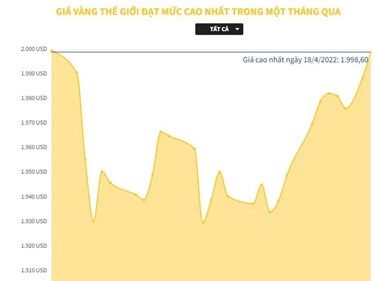 Ngày 18/4, giá vàng thế giới đã có lúc lên đến 1.998,60 USD/ounce - mức cao nhất trong vòng một tháng qua, áp sát mốc 2.000 USD/ounce,