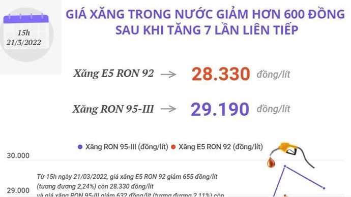 Từ 15h ngày 21/3, giá xăng E5 RON 92 giảm 650 đồng/lít (tương đương 2,24%) còn 28.330 đồng/lít và giá xăng RON 95-III giảm 630 đồng/lít, tương đương 2,11% còn 29.190 đồng/lít./.