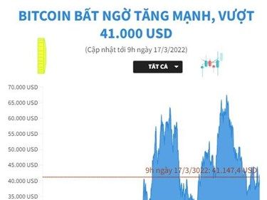 Ngày 17/3/2022, giá bitcoin bất ngờ tăng mạnh, vượt mốc 41.000 USD. Tính tới 9h, đồng tiền kỹ thuật số lớn nhất thế giới này đang giao dịch ở mức 41.147,4 USD.