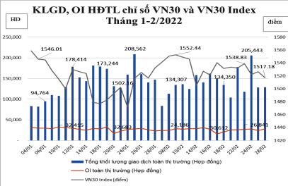 Theo Ủy ban Chứng khoán Nhà nước, tháng 2/2022, chỉ số VN30 giảm 0,98% so với tháng trước và đạt 1517,18 điểm tại thời điểm cuối tháng. Giao dịch trên thị trường chứng khoán phái sinh giảm nhẹ so với tháng trước. Khối lượng giao dịch bình quân 137.395 hợp đồng/phiên.