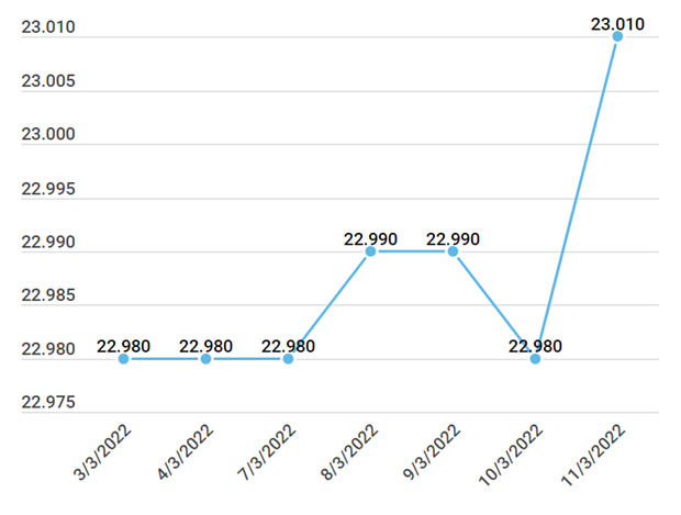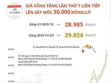 Từ 15h ngày 11/03/2022, giá xăng E5 RON 92 tăng 2.908 đồng/lít (tương đương 11,15%) lên 28.985 đồng/lít và giá xăng RON 95-III tăng 2.990 đồng/lít (tương đương 11,14%) lên 29.824 đồng/lít.