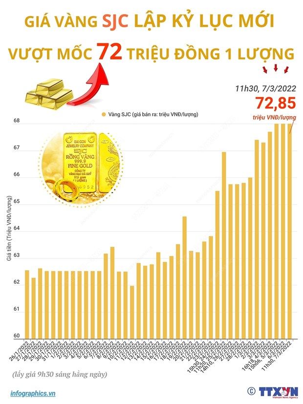 Giá vàng SJC tiếp tục lập kỷ lục mới, gần mốc 73 triệu đồng một lượng
