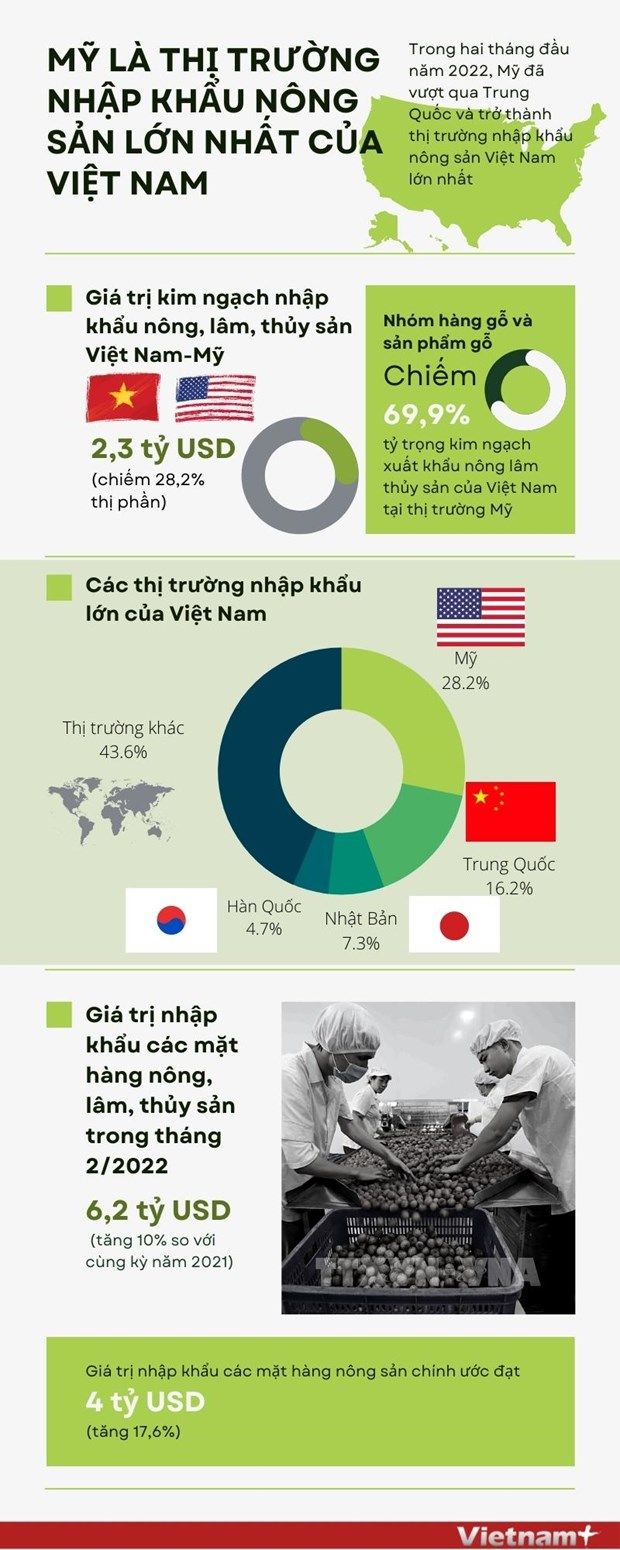 Mỹ đã vượt qua Trung Quốc để trở thành thị trường nhập khẩu các mặt hàng nông, lâm, thủy sản lớn nhất của Việt Nam, các thị trường nhập khẩu tiếp theo là Trung Quốc, Nhật Bản và Hàn Quốc.