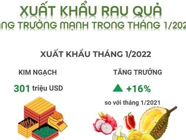 Theo Bộ Nông nghiệp và Phát triển Nông thôn, kim ngạch xuất khẩu rau quả đạt 301 triệu USD trong tháng 1/2022, tăng tới 16% so với cùng kỳ năm 2021.
