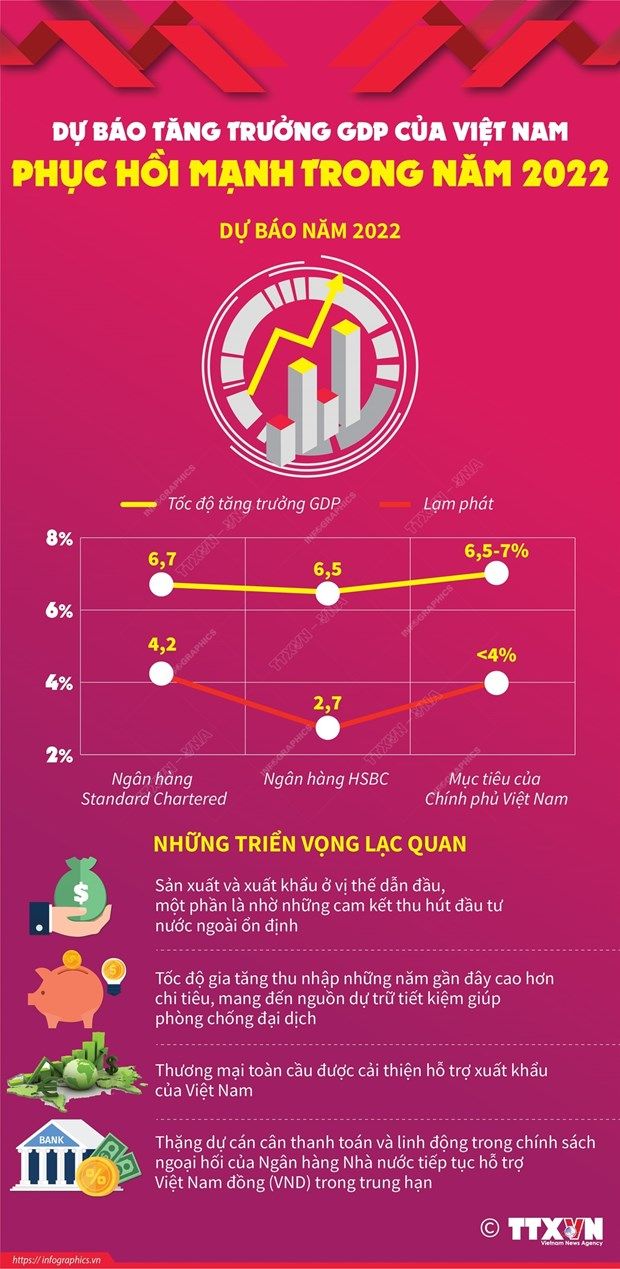Tốc độ tăng trưởng GDP của Việt Nam trong năm 2022 được dự báo sẽ ở mức 6,5-6,7%, nhờ tỷ lệ bao phủ rộng của vaccine phòng COVID-19 và các chính sách phục hồi kinh tế.