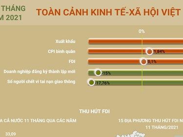 Trong 11 tháng năm 2021, Việt Nam xuất siêu trở lại với kim ngạch xuất khẩu tăng 17,5%, CPI bình quân tăng 1,84% (mức thấp nhất kể từ năm 2016), số người chết vì tai nạn giao thông giảm mạnh 17,76%...
