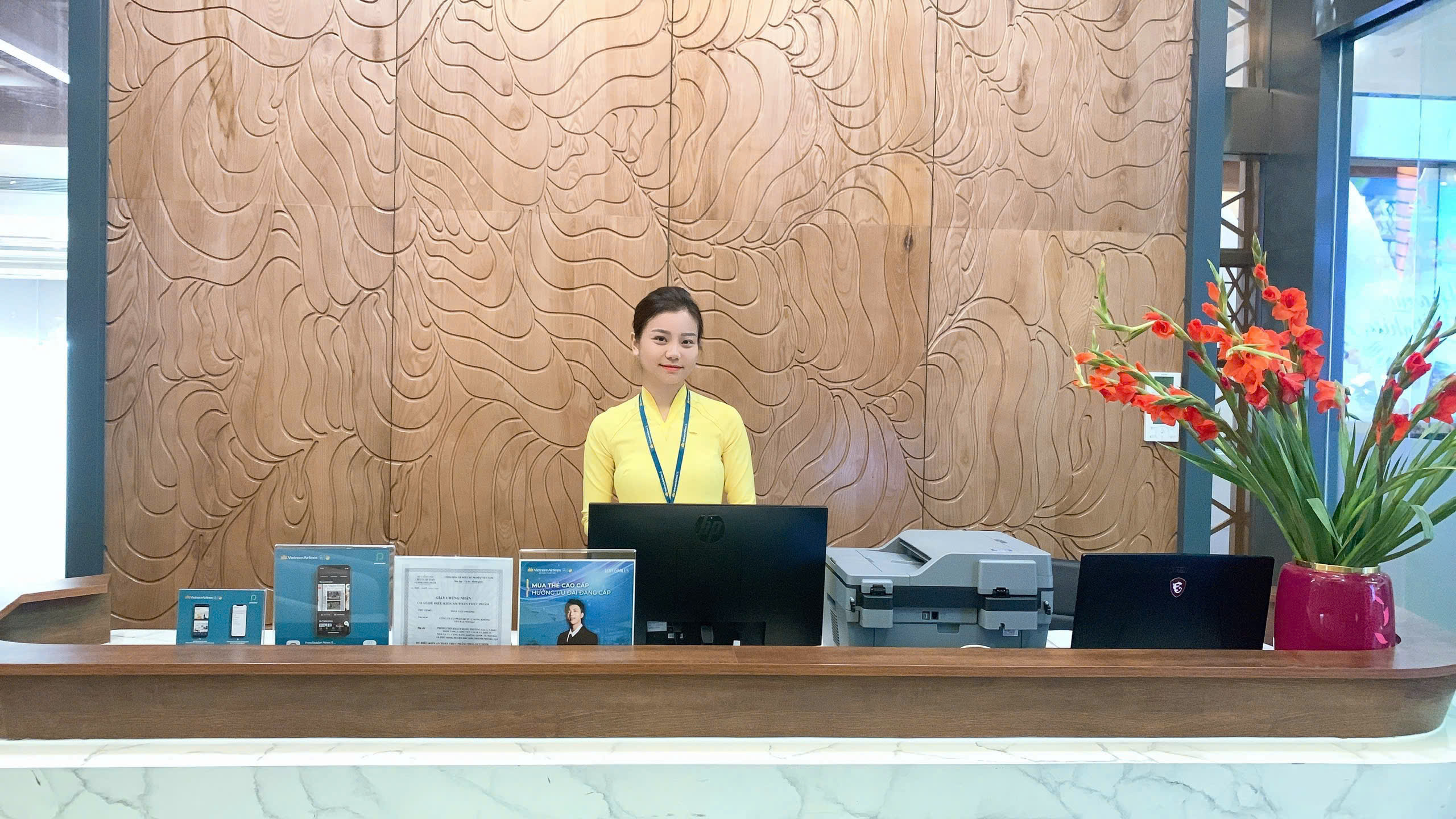 Những cô gái NASCO rạng ngời, niềm nở chào, đón khách sử dụng dịch vụ Phòng khách Bông sen trong tà áo dài thương hiệu VNA