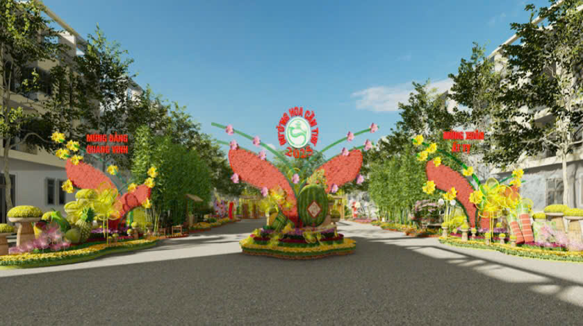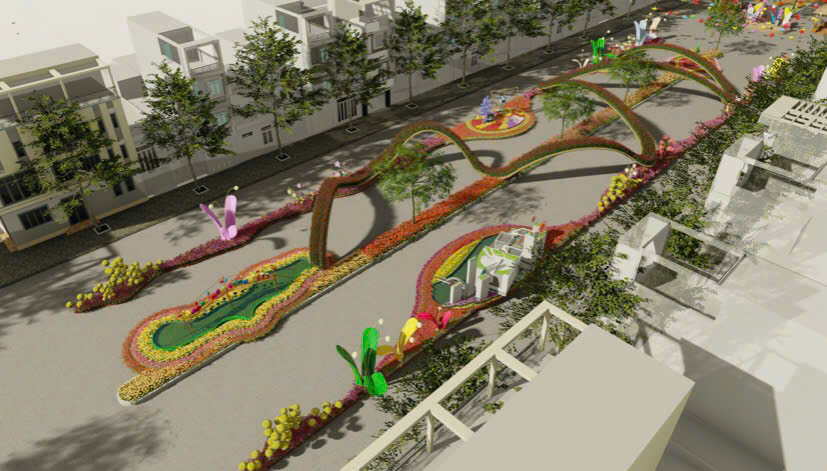 Ảnh toàn cảnh chợ hoa lộ hai chiều trước cửa khách sạn