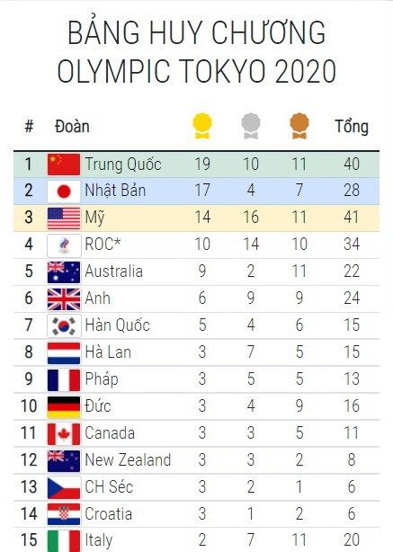 Kết thúc ngày thi đấu thứ 7, đoàn Trung Quốc hiện xếp đầu bảng tổng sắp huy chương Olympic Tokyo 2020 với 19 huy chương Vàng, 10 huy chương Bạc và 11 huy chương Đồng.