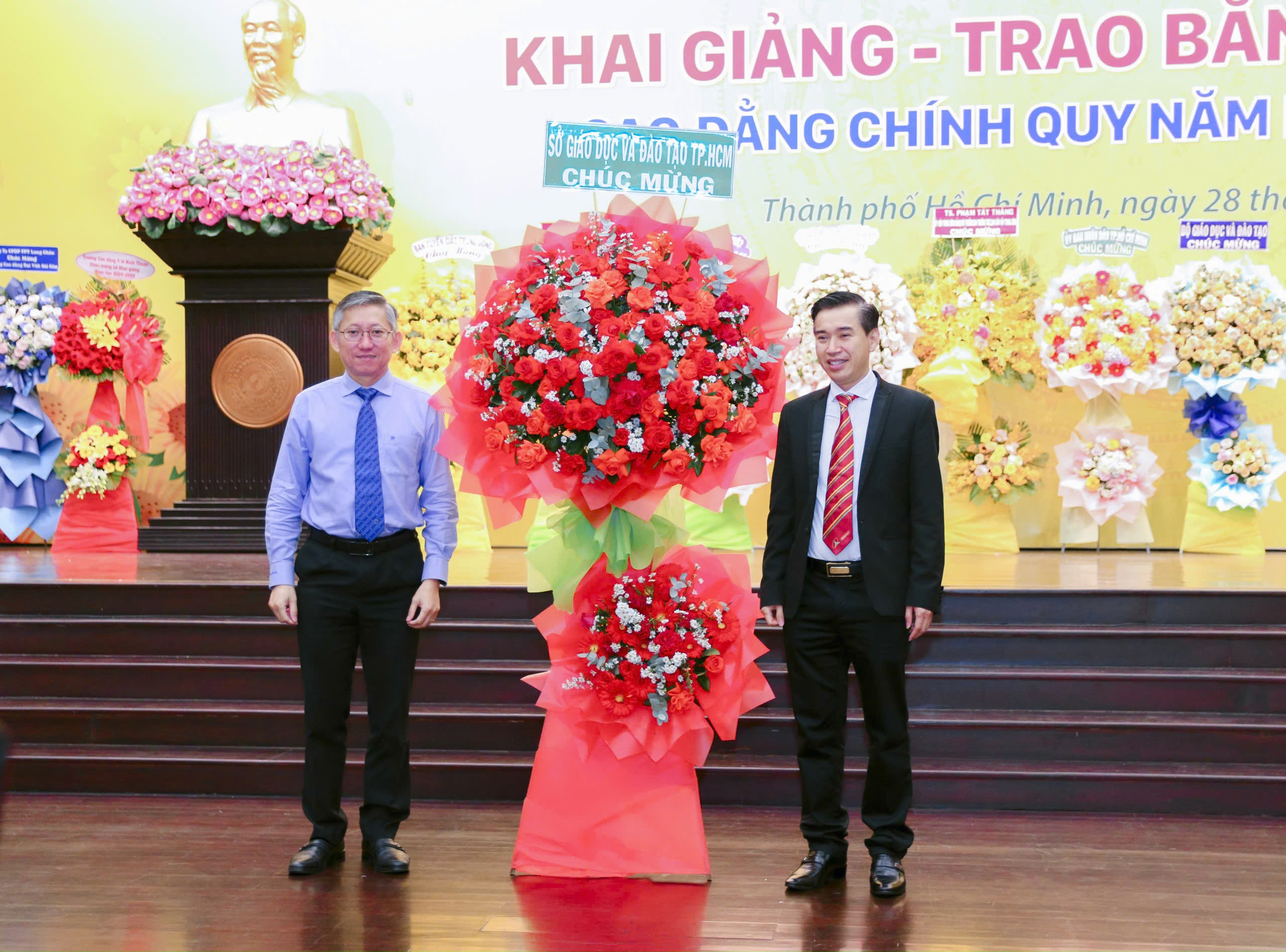 Tiến sĩ Lê Lâm - Hiệu trưởng Trường Cao đẳng Đại Việt Sài Gòn nhận hoa chúc mừng từ lãnh đạo Sở Giáo dục và Đào tạo TP.HCM tại lễ khai giảng.