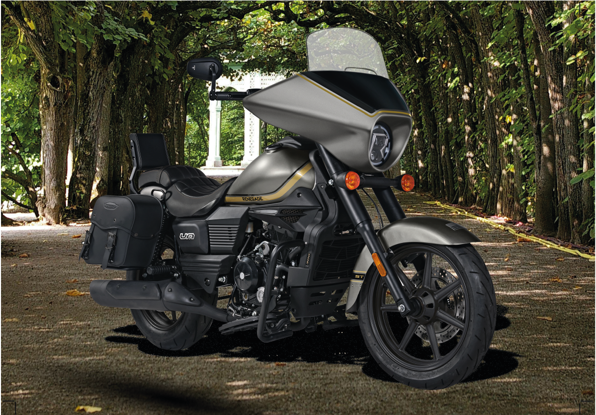Renegade ST 300cc: Chiếc Sport Touring Cruiser này kết hợp sức mạnh và sự tinh tế, nổi bật với ốp đầu xe kiểu batwing bóng bẩy, ABS tiêu chuẩn, cảm biến áp suất lốp và màn hình TFT 7 inch kết nối điện thoại giúp điều hướng dễ dàng. Nâng tầm chuyến đi của bạn với loa Bluetooth, sạc USB và yên xe hai chỗ ngồi thoải mái với tựa lưng tích hợp. Với thiết kế cổ điển và di sản điển hình của những chiếc mô tô cruiser Mỹ, chiếc xe đường trường này mang đến trải nghiệm lái khó quên, một lựa chọn tuyệt vời trong phân khúc cruiser.