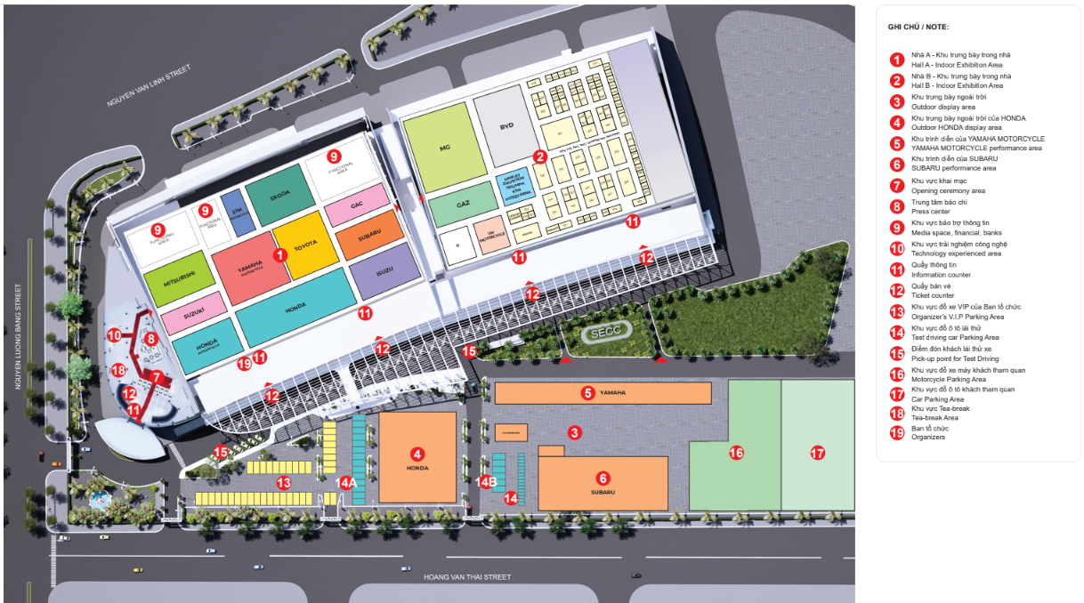 Theo sơ đồ Ban tổ chức công bố, khu vực triển lãm được bố trí tại Nhà A và Nhà B của SECC sẽ là nơi trưng bày chính của các thương hiệu ô tô, xe máy và gần 300 gian hàng thuộc các ngành công nghiệp phụ trợ. Khách tham quan có thể tự do khám phá, chiêm ngưỡng những dòng xe thuộc nhiều phân khúc, từ xe hơi đến xe phân khối lớn và xe máy thông dụng.